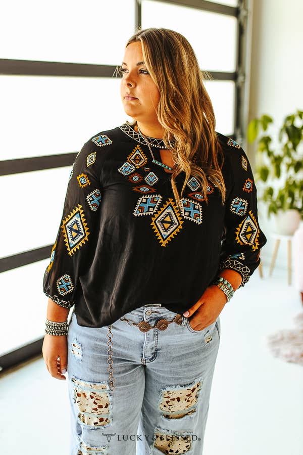Solid 3/4 sleeve chiffon keyhole top with aztec embroidery detail and body lined.