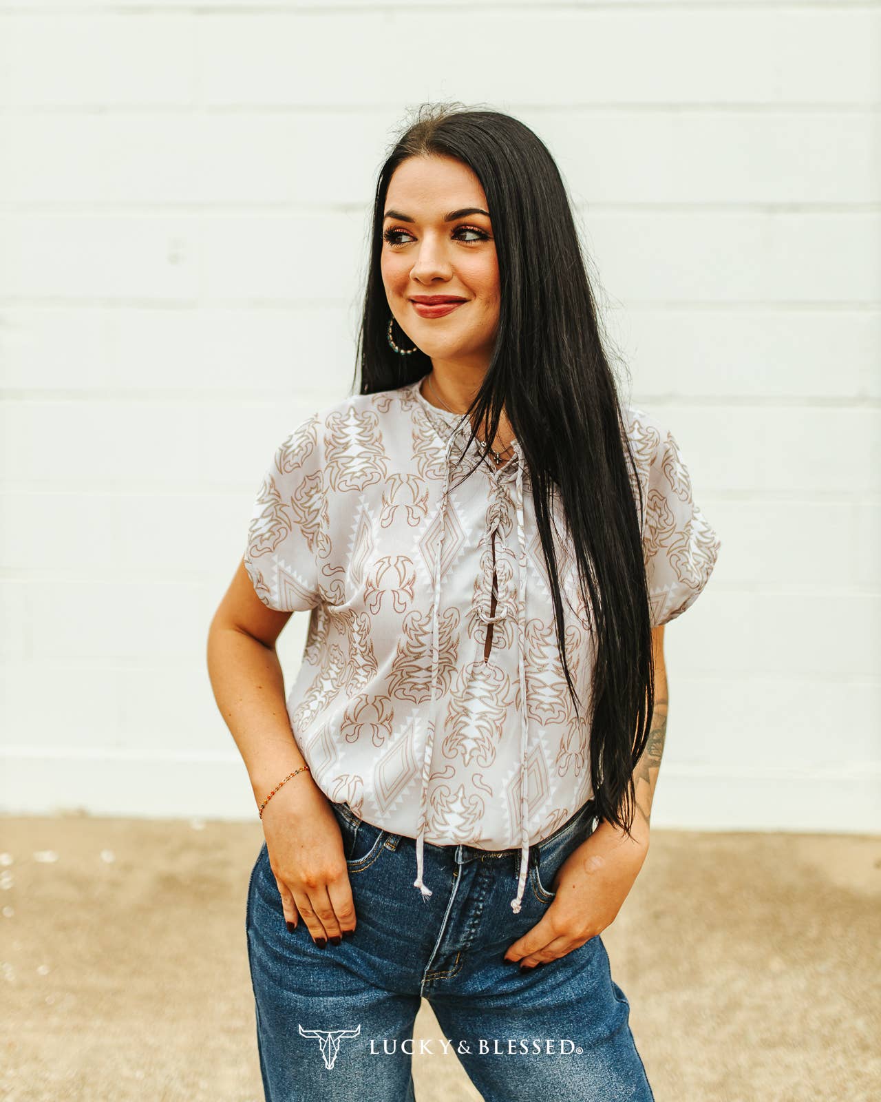 Ivory Boot Stitch Printed Front Tie Short Sleeve Top