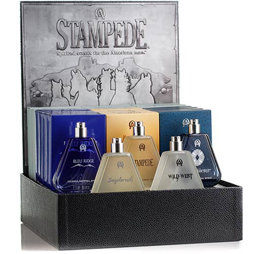 A wardrobe of men's colognes from the all-American perfumery, Annie Oakley comes Wild West®, Caballero™, Bleu Ridge®, Stampede® and Sagebrush® delivering the true American spirit of masculine fragrances in iconic stirrup-shaped bottles. Includes: 15 SKU, 3 of each cologne at 2 fl oz / 60 ml., Testers, and our Stampede point of purchase card to place behind full cologne boxes. Place testers in front of each respectable cologne box along with the tester sticks.