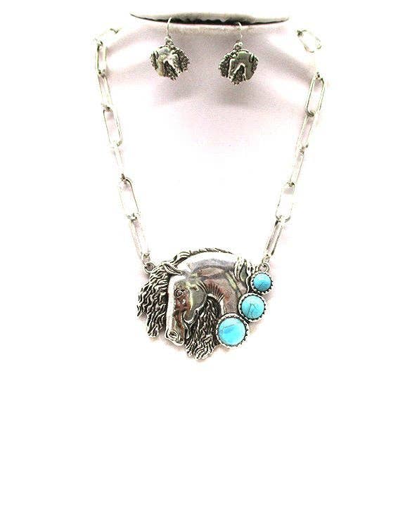 Welcome to Snowing West, where we bring the spirit of the wild west to your wardrobe. Our Western Horse Head Turquoise Necklace Set is a nod to our heritage, featuring a stunning horse head pendant embedded with turquoise. This jewelry set is an ideal choice for those who appreciate western style.